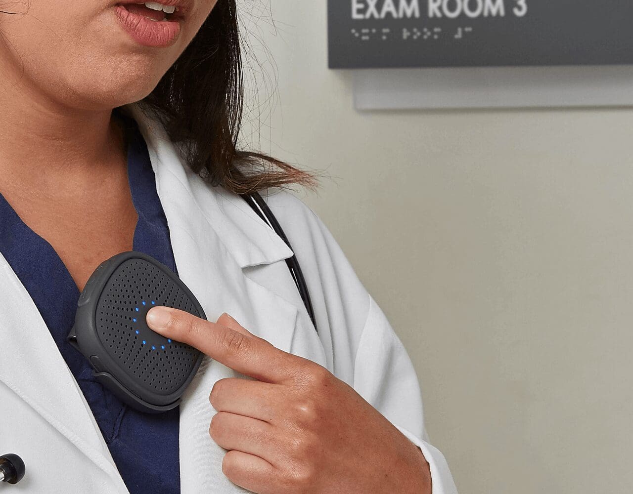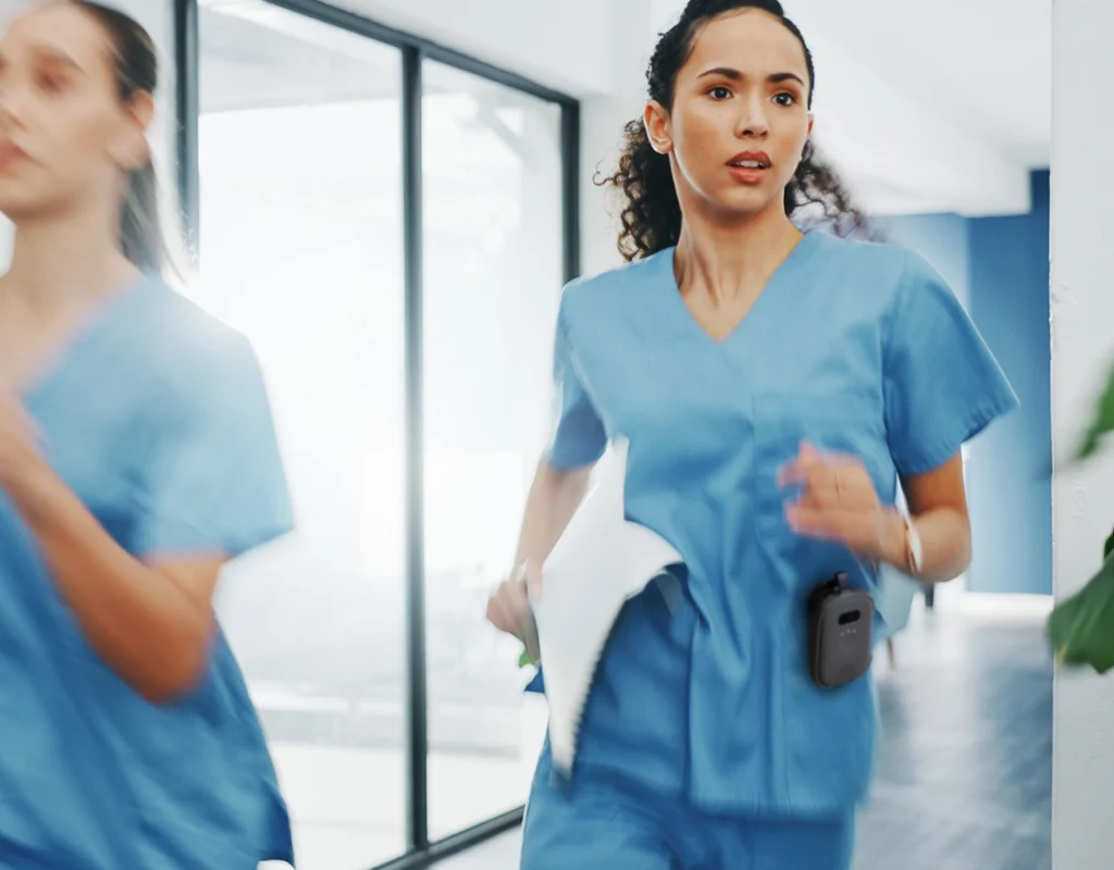 Nurse in blue scrubs running down a hospital hallway with a RelayM device clipped to her pocket for fast communication.